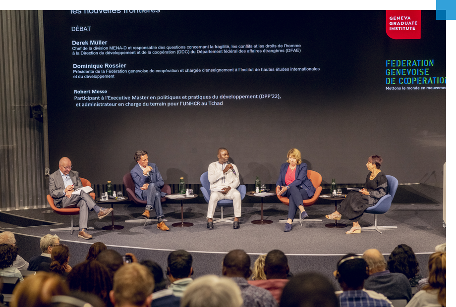 Derek Müller, chef de la division MENA-D et responsable des questions concernant la fragilité, les conflits et les droits de l'homme à la Direction du développement et de la coopération (DDC) du Département fédéral des affaires étrangères (DFAE), Robert Messe, participant de l'Executive Master en politiques et pratiques du développement (DPP'22) et administrateur en charge du terrain pour l’UNHCR au Tchad et Dominique Rossier, présidente de la FGC et chargée d’enseignement à l’IHEID, ont ensuite rejoint Jacques Forster sur l'estrade pour un débat permettant de partager les points de vue.