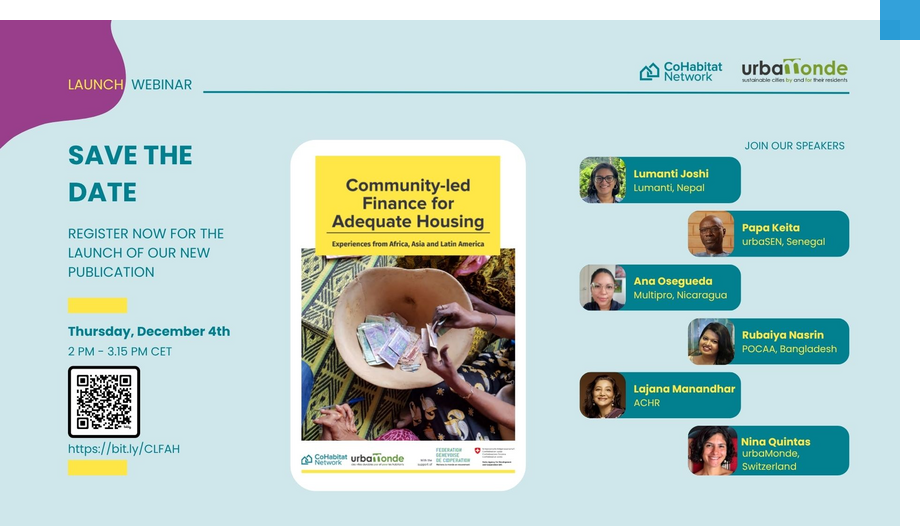 urbaMonde est heureuse d’annoncer le lancement de sa nouvelle publication, Community-led Finance for Adequate Housing, fruit d’un processus de systématisation d’un an mené en collaboration avec ses partenaires locaux d'Asie, d'Afrique et d’Amérique latine, dans le cadre d’un projet de partage des savoirs financé par la FGC.