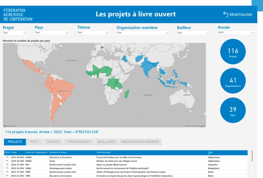 L'outil statistique «Les projets à livre ouvert» a été mis en ligne sur le site de la FGC. Pour chaque année, il permet de visualiser les projets financés par le biais de la Fédération et de faire des recherches à l'aide de différents filtres. Cette base de données interactive offre au public et aux collectivités publiques partenaires une vision annuelle complète sur les pays d’intervention et les thèmes des projets, ainsi que sur les montants versés et les bailleurs concernés par projet et par organisation membre.