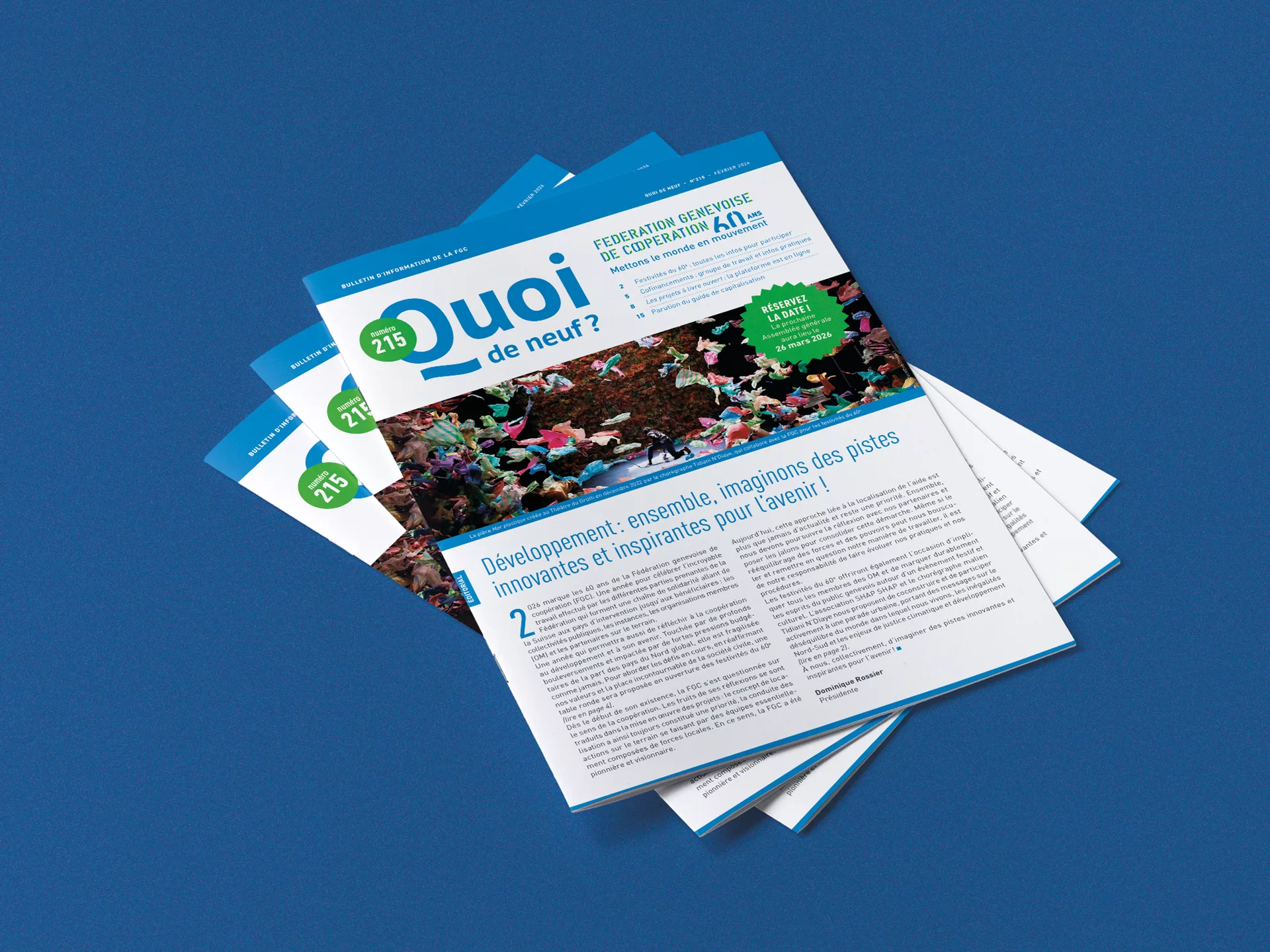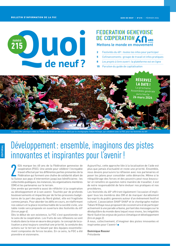 - festivités du 60e anniversaire de la FGC: retour sur le café-débat du 29 janvier qui a marqué le lancement des préparatifs de la Parade de la solidarité et du Forum des organisations membres (OM), un récapitulatif pour tout savoir du programme et des horaires, avec un éditorial de Dominique Rossier, présidente de la FGC, sur les réflexions qui seront menées durant cette année pour se projeter vers l'avenir;