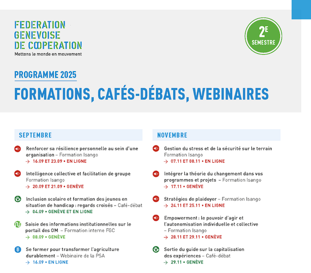 Ce programme offre des occasions de renforcer vos compétences, de développer de nouvelles capacités et de multiplier les échanges avec d’autres organisations romandes actrices de la solidarité internationale ou de l’économie sociale et solidaire.
