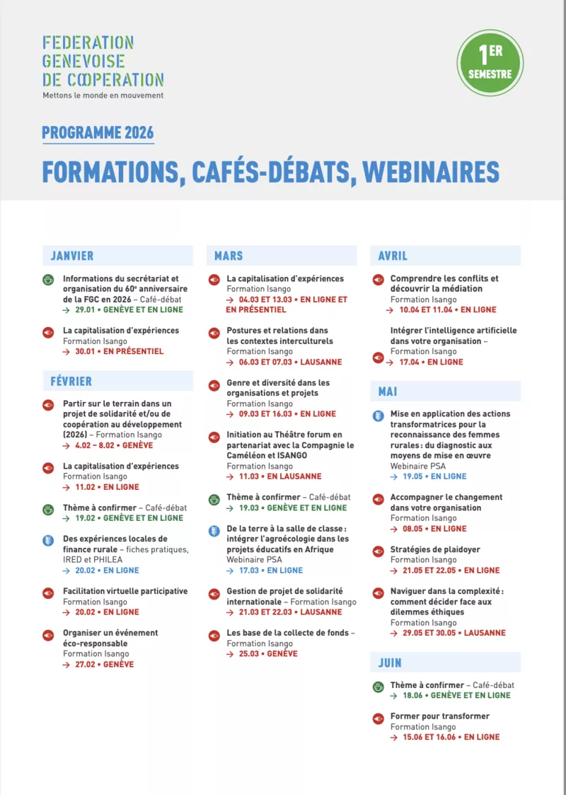 Véritable médiathèque digitale, l’infothèque rassemble les publications éditées par la FGC (dossiers thématiques, journal interne, documents institutionnels) et ses organisations membres, des vidéos (replay de conférence, webinaires, émissions «Esprit solidaire»), des textes de référence sur des thèmes liés au développement et aux enjeux globaux…. Un puissant outil de recherche et différents filtres permettent de retrouver aisément les contenus en ligne.